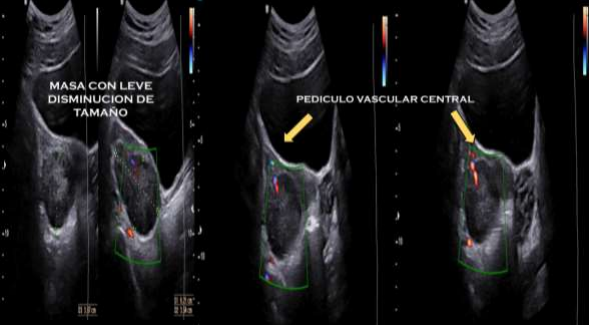 Eight days after surgery, an ultrasound control was performed, finding an adnexa that remained enlarged, however, with a central irrigation pedicle. (Fig. 3)