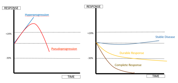Different patterns of response can be achieved with immunotherapy as despicted in this figure. Hyperprogression: Accelerated tumor growht or worsening of the disease after tratment, beyond what is expected. Pseudoprogression: Initial apparent increase in tumor size that is later revealed to be treatment-related inflammation rather than actual disease progression. Stable Disease: The tumor size remains relatively constant over a period, indicating that the disease is neither progressing. Durable Response: Sustained positive response to treatment with long-lasting effectiveness. Complete Response: total disappearance of all signs of tumor disease.