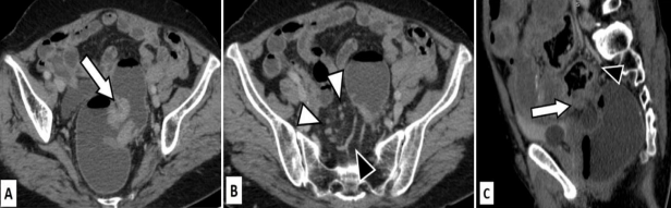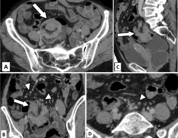 Figures 2A (axial), 2B (coronal) and 2C (Sagittal) CT images in venous phase show telescoping of sigmoid colon into the rectum suggestive of intussusception (arrows). The pericolic fat appears normal, however an enhancing mass can be seen at the of the intussusception. Multiple sub centimetric lymph nodes are seen (arrowheads).