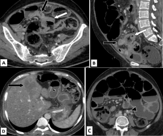 Figure 6C (sagittal CT image in venous phase) shows the wall thickening with pericolic stranding (white arrow) and extramural vascular invasion (black arrowhead). Post-operative histopthology showed tumor confined to the bowel wall (T2) and nodal involvement.