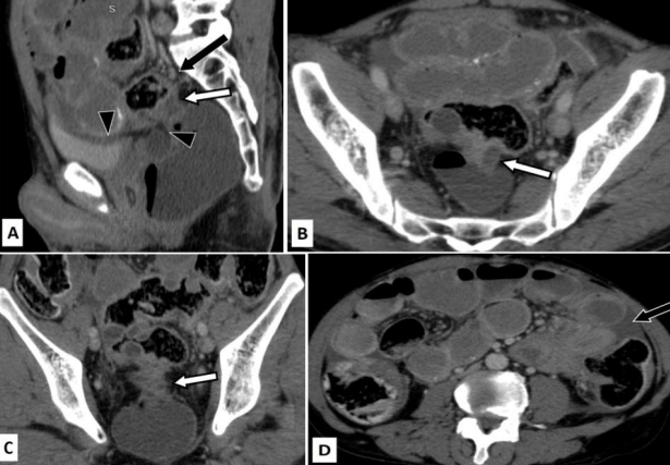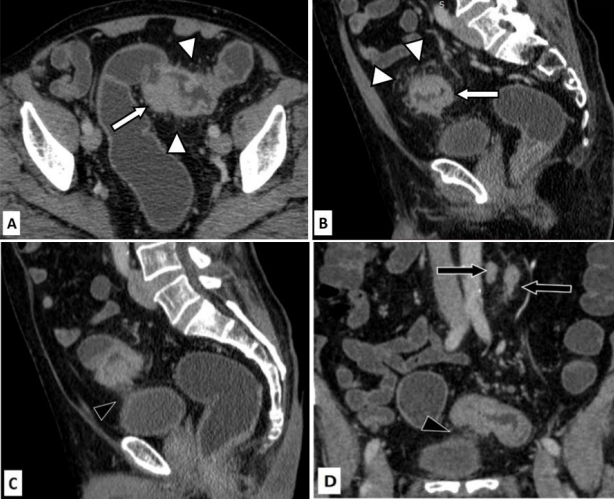 Figures 7A (axial CT image in venous phase) and 7B (sagittal CT image in venous phase) show concentric asymmetric wall thickening involving the sigmoid colon (white arrow) and pericolic fat stranding and extramural venous engorgement (white arrowheads). Figures 7C (sagittal CT image in venous phase) and 7D (coronal CT image in venous phase) show involvement of the pericolic fat inferior to the sigmoid colon reaching up to the superior wall of urinary bladder probably breaching the peritoneal reflection (black arrowheads). Two enlarged lymph nodes with perinodal stranding are seen in left para-aortic region (black arrows). Surgical excision of the involved segment was done. Post-operative histopathology revealed T3 tumor with nodal involvement.