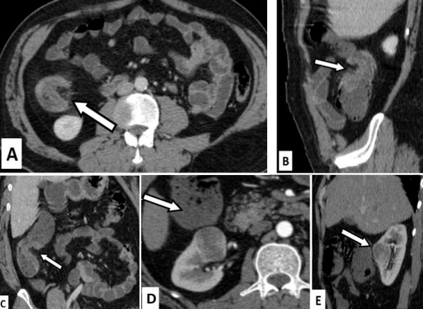 Figures 5A (axial CT image), 5B(sagittal CT image) and 5C (coronal CT image) show asymmetric eccentric enhancing wall thickening involving the caecum and ascending colon (arrows) without any significant pericolic stranding. No significant nodal involvement can be seen. Figures 5D (axial arterial phase image) and E (sagittal venous phase image) show a well-defined hyper enhancing lesion in the mid pole of right kidney.