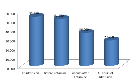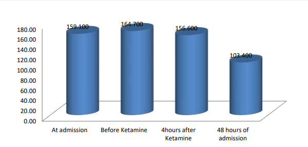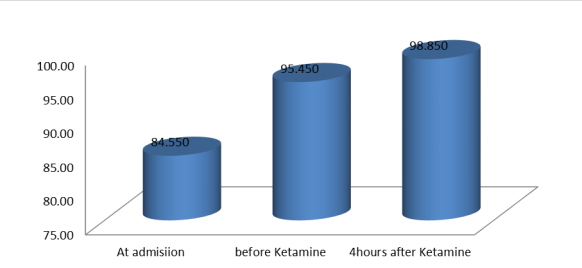 At admission, the mean SpO2 (blood oxygen saturation level) was 84.550%, significantly improved to 95.450% before ketamine administration. Following ketamine infusion, there was a further increase in SpO2 levels, reaching 98.850% 4 hours afterward.