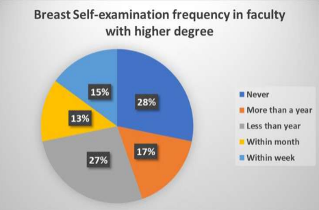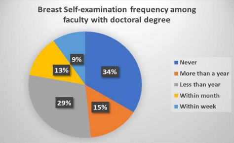 Percentage of breast self-examination frequency among students has shown that 38% never done, 11% more than a year and 28% less than a year (Figure 4). The percentage frequency of breast self-examination among faculty with higher degree indicates 28% never, 17% more than a year and 27% less than a year (Figure 5). Even faculties with doctorate had shown the breast self- examination frequency percentage as 34% never, 15% more than a year and 29% less than a year in our survey report analysis (Figure 6). These results suggest that the lack of awareness about the sequential breast self-examination among the women in our study population.