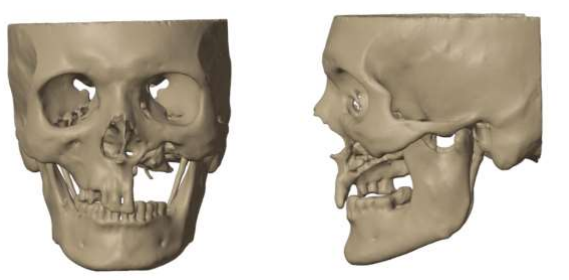The extraoral and intraoral examination revealed the absence of the maxilla, hard palate, and nasal floor of the left side. The nasolabial fold was obliterated, with drooping of the corners of his mouth, and insufficient upper lip support. The patient was classified as having Brown II maxillectomy defect with the aim of the reconstruction being to obturate the defect and restore the facial profile and function. The main goal was to deliver a patient specific implant supported prosthesis in which the intaglio surface of the prosthesis would share the support and stabilization functions and the retention would be dependent on the implants.
