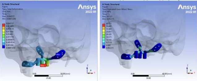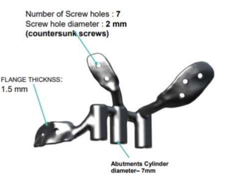 In the paper presented, PSIs with 3 integrated internal hex of implants were used and pedicled temporalis muscle flap was used for soft tissue coverage. The powder size was kept 30 microns with a layer thickness of 20-80 micrometer. Scanning speed was kept 4.5 meter/second with the laser power being 100 W. The transitional fillet radius of the implant was 1.5mm with “I style” fixation plate used. The implants were printed using Ti6Al4V titanium alloy and FEA analysis was used to calculate von Misses stress on the implant making sure that the maximum stress on the implant being less than the