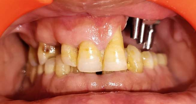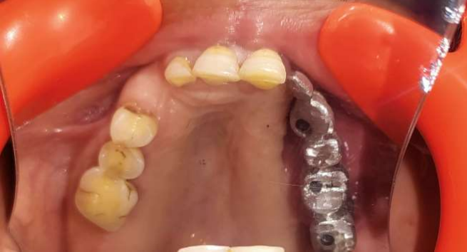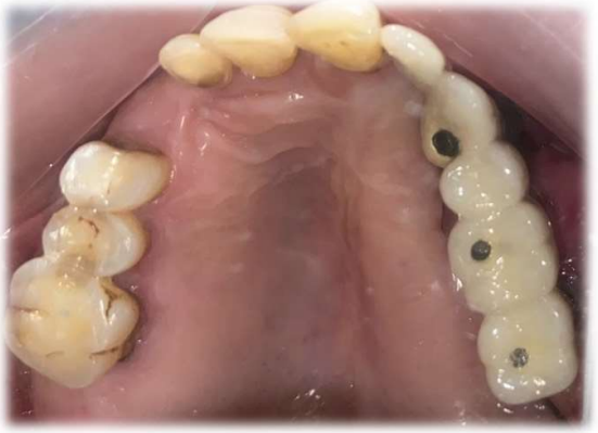 The implants were carefully planned to have abutments aligned with the teeth present in the mandible and to avoid any offset loading as a result of a cantilever. According to literature and also according to the authors experience, the PSI should be kept submerged for at least 6-8 weeks before second stage surgery thus allowing adequate time for healing and stabilisation of the soft tissue component (Figure 8). After waiting for 6 weeks, surgical exposure of the prosthetic components was done, impressions were made with polyvinyl siloxane impression material and the intermaxillary jaw relationship was recorded using aluminum-containing wax (Aluwax; Aluwax Dental Products) (Figure 9,10). The interim prosthesis was delivered and a Porcelain fused to Metal (PFM) permanent prosthesis was planned. A metal try in was done followed by cementation of the final prosthesis (Figure 11). Utilizing high quality porcelain-fused-to-metal, the prosthesis achieved both durability and aesthetic appeal (Figure 12). Gingival porcelain was added to compensate for the lost soft tissue. Occlusal adjustments were made, and speech quality was evaluated. This prosthetic concept achieved patient satisfaction, restored masticatory function, markedly improved speech and improved the lost facial profile contour and lip support.