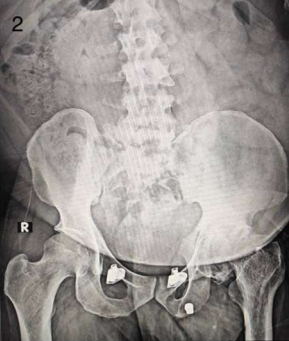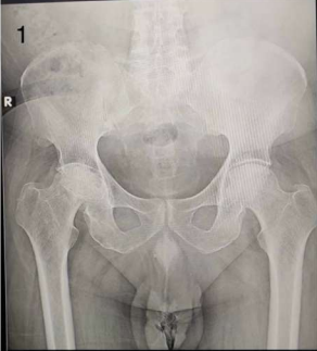 Figure 1: Plain X-ray of pelvis with both hip joints of a 51 year old male having stage 4 AVN of hip, involving the right side.