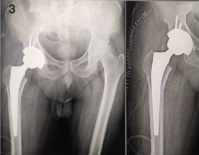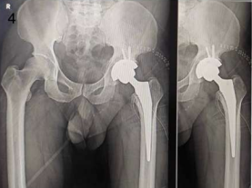 Figure 3: Post-operative X-ray of right hip AVN after uncemented THR on right side.