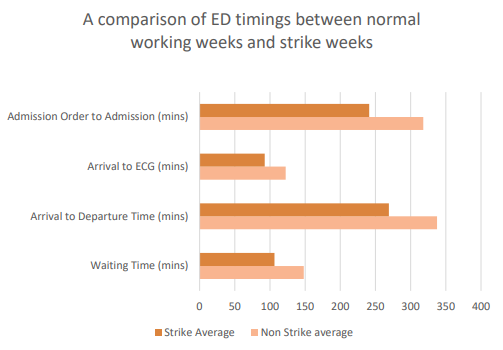 Indicating an overall improved proficiency, which goes beyond just maintaining the functioning. This suggests that the presence of the consultants and staff brought in to stabilise the emergency department effectively managed during the strikes. It also highlights that during a normal working week, there are factors that stop it from optimal function, which should also be investigated further. This could be an indication that the overworking of junior doctors has meant a deterioration of their ability to cope fully with the high demands of the emergency department. Which as previously mentioned is one of the reasons for the strikes.