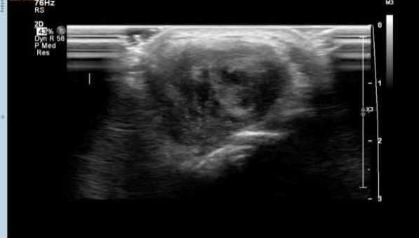 The features of nodular fasciitis on ultrasound and magnetic resonance imaging (MRI) are non-specific, with the lesions appearing as well-circscribed, round to oval masses. Signal intensity of the condition is variable, with intramuscular lesions appearing mildly inhomo-geneous and hyper intense to skeletal muscle on T1-weighted spin-echo images, and subcu-taneous lesions being markedly hypo intense to skeletal muscle on all spin-echo sequences and appearing homogeneous in texture. High cellularity and micro-vessel density may di-rectly influence the early enhancement after intravenous gadolinium injection and compact cellularity with a prominent capillary network. A myxoid pattern may be responsible for the enhancement on MRI (7,8).