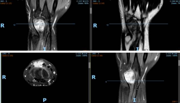 Case Presentation: A 33 year old male with a desk job, presented with a rapidly growing lesion over the dorsum of left wrist over 5 months, associated with pain and restriction of dorsiflexion of wrist. The Xray, ultrasound and MRI images were inconclusve and excisional biopsy was done for definitive diagnosis.