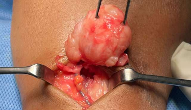 To obtain a definitive diagnosis, an excisional biopsy was performed under general anesthe-sia, revealing a 3x3 cm non cystic hard soft tissue mass attached to the dorsal joint capsule. The lesion was well circumscribed, and the encapsulated lesion was completely excisiond. The adjacent tendons and vessels were taken care of to avoid damage.