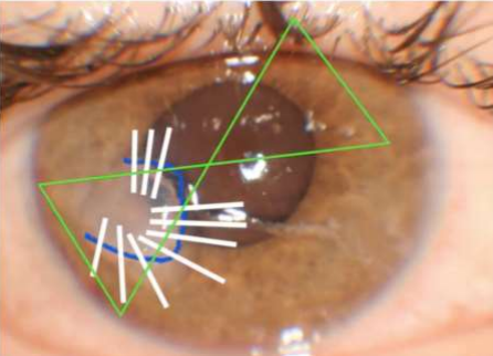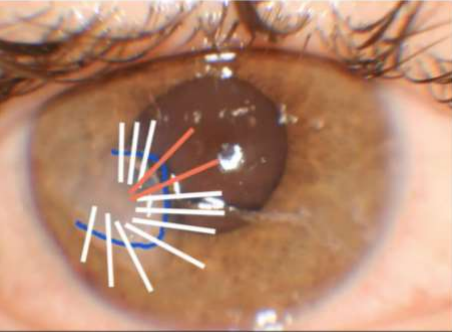 Harmful to optic zone 2 stitched sutures marked in red were replaced with the one belting suture. Fig 5