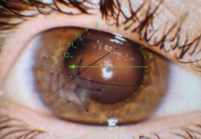 The wound repair surgery performed: ? routine stitched-suturing technique was used for all edges of the wound with the exception of the one adjacent to the optical zone which required the tension force directed to the center of the cornea. The one belting suture was placed for that direction, and finally a gas-permeable soft contact lens attached to the patient's eye to reduce postoperative pain and some improvement of VA.