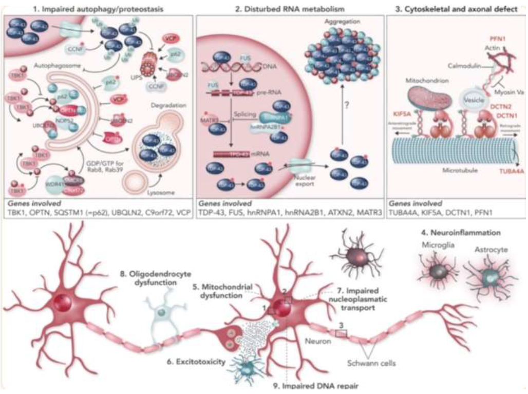 Neuropathological signof ALS is characterized by loss of the neuromuscular connection, axonal retraction and subsequent cell death of UMNs ( upper motor neurons ) and LMNs(lower motor neurons ), surrounded by astrogliosis[4] and microgliosis, with ubiquitin?positive inclusions being observed in surviving neurons.[5] TDP?43 is main component of these inclusions in more than 95% of ALS[6] patients . TDP?43 is an RNA? and DNA?binding protein involved in multiple processes such as transcription, splicing, micro RNA maturation, RNA transport and stress granule formation. In[7] line with its nuclear and cytoplasmic functions, TDP?43 can shuttle between the nucleus and the cytoplasm, but its localization is mainly nuclear. Unlocalization to the[8] cytoplasm, leading to nuclear depletion of TDP?43 along with cytoplasmic protein aggregation,[9] is a hallmark of ALS.