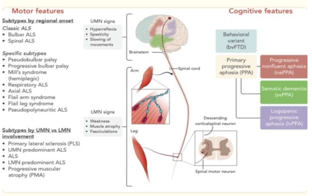 It is neurodegenerative disorder affecting primary motor system but in which extra motor manifestation are increasingly recognized .ALS often has a focal onset but subsequently spreads to different body regions, where failure of respiratory muscles typically limits survival to 2–5 years after disease onset. In up to 50% of cases, there are extra?motor manifestations such as changes in behaviour, executive dysfunction and language problems. In 10%–15% of patients, these problems are severe enough to meet the clinical criteria of frontotemporal dementia (FTD).