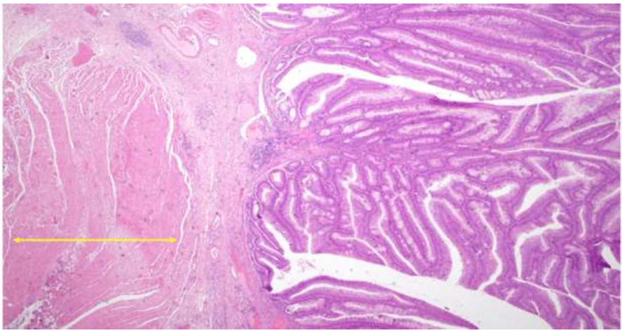 Here we report the case of a 77-year-old ASA 2 woman, who underwent to colonoscopy for sideropenic anemia and positive FIT. Examination showed a rectal granular nodular-mixed laterally spreading tumor (GM-LST) with a dominant nodule of 5 cm and a psudodepressed central area [figure 1,2]. The lesion was extended on the two third of rectal circumference involving the second and the third Huston fold and was judged suspected for invasive carcinoma. The histological examination reported low and high-grade dys-plasia. At total body computed tomography (CT) no metastatic lesion was detected. Pelvic magnetic reso-nance (MRI) was consistent with T2N0, showing the extension of the lesion nearby the muscularis propria, without a clear distinction plane. In addition, a rectal endoscopic ultrasound (EUS) was requested, confirm-ing the MRI findings. Given the well-known risk of EUS and MRI overstating, as reported by recently re-leased ESGE guidelines [4] and after a gastrointestinal multidisciplinary team (MDT) discussion, the pa-tient was proposed for endoscopic submucosal dissection4. For the procedure, we used a standard diag-nostic Pentax gastroscope mounted with a conic distal end cap (ST Hoods, Fujifilm®). First, a mucosal incision was made approximately 5mm around either the proximal and distal side of the rectal lesion, fol-lowed by submucosal dissection using DualKnife J 1.5mm (Olympus®). During the dissection, a deeper submucosal invasion was suspected beneath the dominant sessile nodule, where the submucosal space was progressively disappearing for muscular retraction and also for fibrotic reaction [Figure 3]. In this area we moved to the inner circular muscular layer dissection, even using the same small tip knife. The dissec-tion was completed using the Hook Knife J (Olympus) for the lateral part, resulting in complete resection of the lesion, 10x6 cm in size [Figure 4]. The resection phase took 90 min. Hemostasis was achieved with monopolar forceps (Coagrasper - Olympus®). The base was sutured using through-the-scope clips and a hemostatic matrix (Purastat®, 3ml) was apposed to prevent delayed bleeding. Precautionary, the patient was hospitalized for three days and then discharged after uneventful observation. Histological examination of the lesion reported well-differentiated adenocarcinoma (G1) focus over a high-grade dysplasia tubulovil-lous adenoma, no tumoral budding or vascular invasion, absence of tumor on the resection plane and sub-mucosal invasion limited to 500 μm. Histopatology also showed the circular muscular layer on the resection plane of the lesion [Figure 5]. MDT indication was endoscopic follow-up after 6 months.