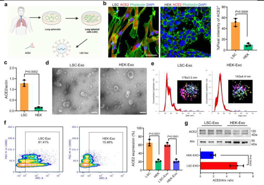 Figure 1 : A. Demonstrating extraction scheme of LSC and LSC-Exo from healthy donors, created with Biorender.com. B. Demonstrating immunofluorescence staining and quantification analysis of ACE-2 on LSC and HEK. Scale bar: 50 μm. n = 3. C. Demonstrating Western blot quantification of ACE-2 expression in LSC and HEK, which derived from the same experiments and processed in parallel. n = 3. D. Demonstrating representative TEM images of LSC-Exo and HEK-Exo from 3 independent experiments. Scale bar: 100 μm. E. Demonstrating measurements of size distribution of LSC-Exo and HEK-Exo via nanoparticle tracking analysis. Inset: 3-colar dSTORM image of CD63-Alexa Fluor®-488, PE-CD9, APC-CD81 of LSC-Exo or HEK-Exo. F. Demonstrating quantification of ACE-2 expression on LSC-Exo and HEK-Exo by flow cytometry. n = 3 [7].