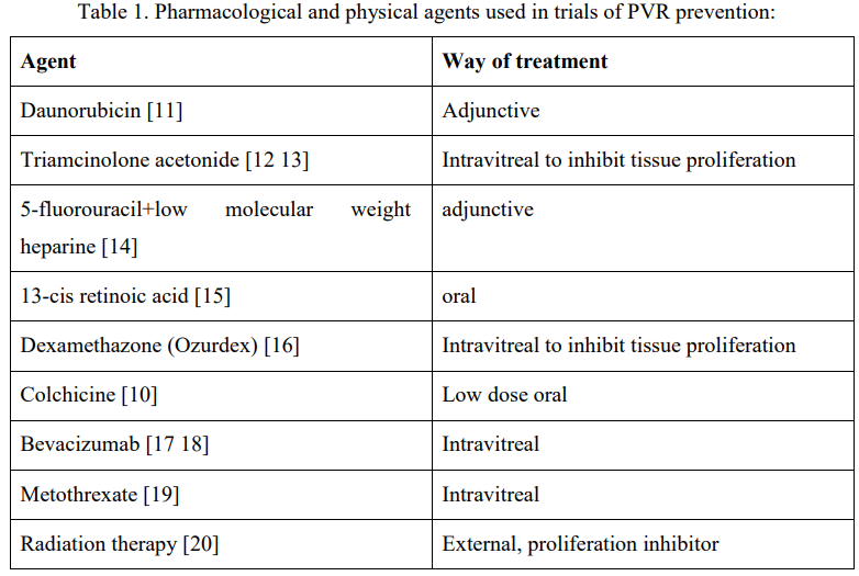 Table 1. Pharmacological and physical agents used in trials of PVR prevention:
