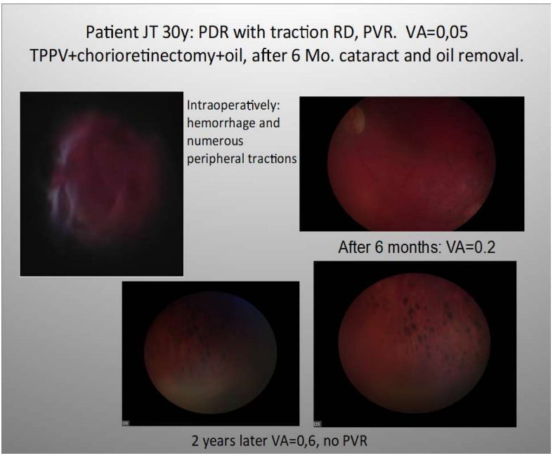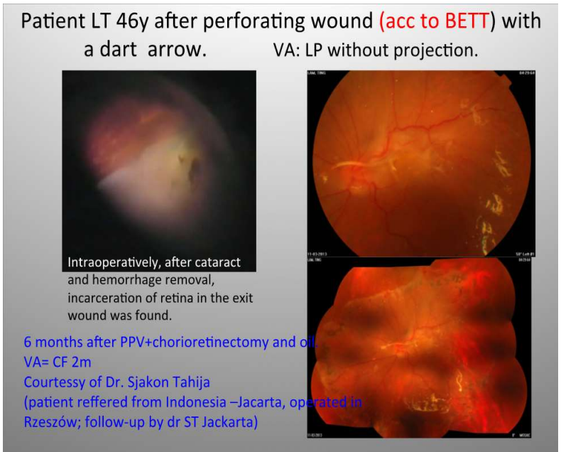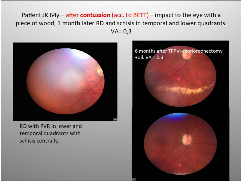 Fig 1. demonstrates the eye which developed retinoschisis with RD encompassing inferior and temporal quadrants with macula off 1 month after contusion (acc. to BETT) – the eye was hit by the piece of wood. Retinoschisis itself is a condition with 30-40% risk of PVR development and in this case the process has already started. Chorioretinectomy was performed along the retinotomy site (fig. 1B). 2 years later retina remained attached with no PVR (fig.1C). Another example in this group was a complex re-RD with retinal incarceration after perforating wound with dart arrow (Fig.2. a), VA was LP without localization. Retina was attached after PPV with 360 retinectomy and chorioretinectomy serving as a tool of liberating the retina from exit wound the retina was attached under oil (fig. 2 b- 1 month postop). No PVR 6 months postoperatively was found (fig.2c). It remained attached after oil removal 16 months later.