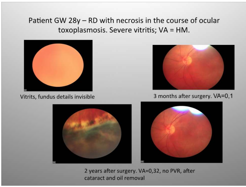 In the case of toxoplasmotic uveitis infection activate cascades of events starting from RPE monolayer disruption and migration together with blood-retina barrier breakdown, which promote inflammation and may lead to membrane formation [27]. Toxoplasmosis usually presents as a focal necrotizing retinitis associated with vitritis – the typical picture was also seen in our case (fig. 4) [28, Frau, 1997 #853]. RD (5-6% affected eyes) develops either as rhegmatogenous type due to retinal breaks in the necrotic retina or a tractional one due to severe inflammation with PVR [28 29]. Our patient presented himself as an RD with severe retinal necrosis and vitritis was at high risk of PVR development according to these observations. Here PPV with ILM peeling and chorioretinectomy not only cleared the eye from inflammation threatening to tissue integrity, but also save potential retina destruction heavy scarring process. Such eyes, as it was decribed previously if left untreated, end up with no light perception and phthisis [28 30, Konstantinidis, 2009 #852].