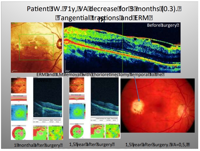 There were two cases of tractional RD in the course of active PDR (fig. 3), 1 eye with RD in the course of retinal necrosis caused by Toxoplasma gondi active infestation. In this eye there was additionally heavy vitritis with lot of pigment particles liberated from the retinal tissue (fig. 4a). We suspected that without any preventive action PVR would have developed, especially because this patient was young. Postoperative appearance 3 months and 2 years after surgery is demonstrated on Fg 4 b-d. The retina remained attached with no signs of PVR. The last case from this group presented ERM emerging from extrafoveal hyperpigmented CNV scar. Epiretinal scar tissue grew over the macula causing deformation and pucker of the fovea accompanying with the vision drop and metamorphopsia. This was patient’s better eye, the other eye was amblyopic. This case is demonstrated on fig. 5 with OCT and fundus photographs. After focal chorioretinectomy with complete destruction of the pigmented scar to the bare sclera, macula became smooth and VA improved with decrease of metamorphopsia. In non-traumatic group the initial BCVA was better than in trauma cases and the functional improvement was much better and also remained stable with time.