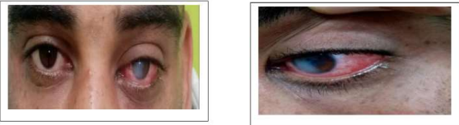 On examination, the right eye is normal. In the left eye, there was diffuse conjunctival redness, a corneal opacity taking up the 3⁄4 nasal of the cornea from 6 a.m. to 11 a.m., the edges of which were positive for fluorcein. A peri-lesional edema is also noted.