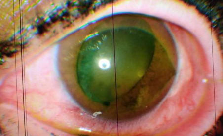 This was a patient aged around 60 with no particular history, who consulted the emergency department for a painful red eye associated with a drop in visual acuity, all occurring in the context of a domestic trauma (inadvertent elbow strike) that had occurred around 8 hours earlier.
