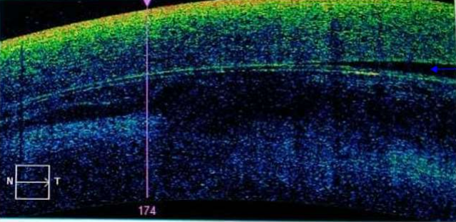 Image 2: OCT of the cornea showing partial contact of the lens with the corneal endothelium (blue arrow indicating absence of contact).