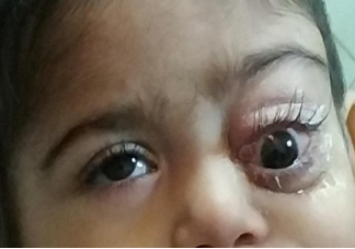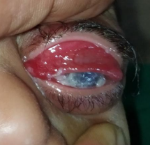 Figure 5. Day 11 photograph of the boy showing increased proptosis, palpebral conjunctiva congestion and corneal keratopathy.