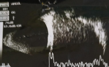 Figure 3. Ultrasound biomicroscopy scan of left orbit showing homogenous lesion superior to globe with mild to moderated spikes.