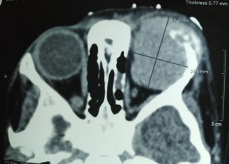 Figure 4. An axial contrast enhanced CT orbit reveal left eye proptosis and heterogeneously enhancing soft tissue mass lesion of size 32×25×27 mm in extraconal space of left orbit, possibly arising superolateral wall (frontal bone) of left orbit showing speculated/ ‘sun-ray’ periosteal reaction (arrow head). CT=computed tomography.