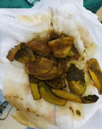Laboratory investigations were unremarkable. Patient was taken for diagnostic laparoscopy after stabilization of his condition, the finding was, proximal small bowel dilatation up to distal ileum with hard transition point about 50 cm from ileocecal valve with distal collapsed ileum and colon. Transition point delivered out through small RIF Lanz incision and entrotomy finding are, thick undigested food particles (squid particles) causing mechanical intestinal obstruction. (figure 1&2) Primary repair was done for entrotomy site, patient did well and discharged home after 3- days of hospital admission in a good condition.