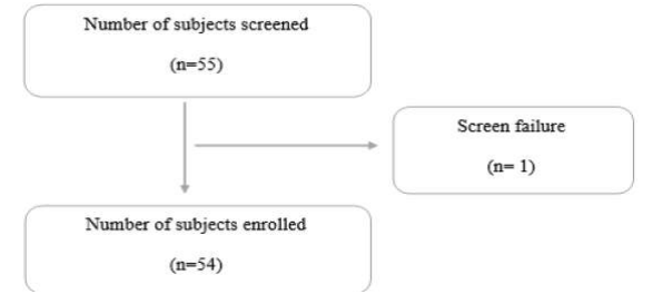 The study screened 55 subjects, with 54 being eligible based on inclusion/exclusion criteria. Figure 3 summarizes patient disposition.