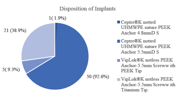 The study analyzed the demographics and surgery details of 54 patients, with a mean age of 58.7 years and a majority of females (57.4%) and males (42.6%). The majority (63%) underwent arthroscopic cuff repair with acromioplasty of the right shoulder, followed by 25.9% with arthroscopic cuff repair with acromioplasty of the left shoulder. The mean follow-up duration was 13.5 months. Out of 54 patients, 95.4% received Ceptre® knotted UHMWPE suture PEEK anchors, while 48.1% received Viplok® knotless PEEK anchors. Fig 4