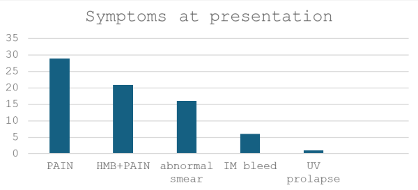 Fig 4: This graph shows the symptoms at presentation to clinic .Most women presented with abdominal pain.