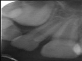 Figure 4: Radiograph revealing a calcified mass between premolars.