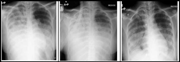 She was started on intravenous cyclophosphamide. However since there was not much improvement in oxygenation and persistent lung infiltrates, after multidisciplinary discussion she was given 7 cycles of plasmapheresis and IV Rituximab. She gradually improved clinically , her serial chest x rays showed improvement , oxygenation improved and was eventually decannulated from ECMO on day 7.Sedation was slowly withdrawn , her GCS improved and she was gradually weaned off from ventilator support over next 5 days. She was mobilised, was given adequate chest and limb physiotherapy and was shifted to ward on minimal oxygen support over next 5 days. Eventually her oxygenation improved and she was discharged without oxygen support with tapering steroids and PCP prophylaxis. She had followed up at OPD and was free of symptoms, chest x ray showed significant improvement with complete clearing up of parenchymal infiltrates. Below are the serial Chest X rays taken during the course of hospital admission and follow up.