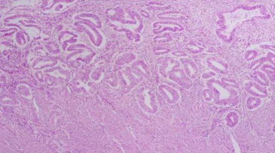 H and E images showing endometrial glands crowded and superficial invasion of myometrium