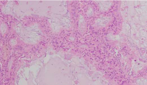 H and E images showing endometroid carcinoma with central mucin present.