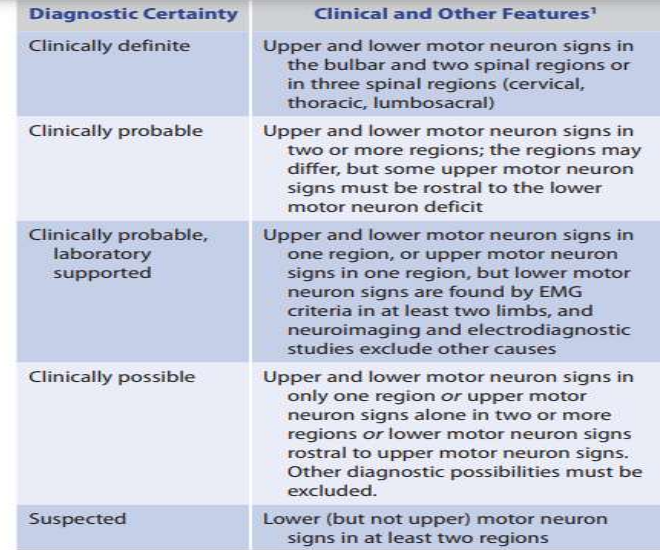 – Definite ALS: UMN and LMN signs in 3 regions (bulbar + 2 spinal or 3 spinal)