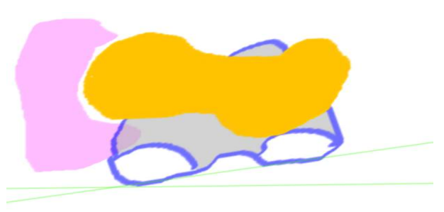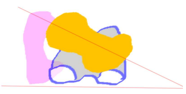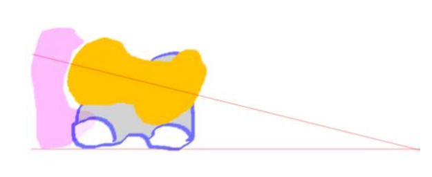 Figure 1: An example of the femoral shaft at approximately 20 degrees is shown. In this image (and images 2 and 3), the surface gives the impression that the femur of a person lying on their back is "under the spear". (That is, the image is viewed from a point on the ilium, at the level of the femur, from the distal end to the knee). The femoral condyle (blue pattern) on the head and neck surface (yellow) remains in place and points to the acetabulum (red).