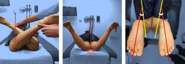 Figure 5: Left) external hip rotation; middle) internal rotation of the hip; ) angle. People with bunions may have a hill or curve on the outside of their foot instead of a straight edge, a sign of possible metatarsal adduction. Additionally, this often occurs with the medial plantar fold. You can check the heel bisector, which is the axis where the heel connects to the level of the toes. If the line comes out from the second and third toes, this is considered normal because the line comes out further from the toes and this is a sign of forefoot adduction. The examiner must determine whether the deformity is rigid or flexible (passively correctable to moderate or extreme). . (Even if testing is performed, it is generally not recommended to take radiography before this age.)