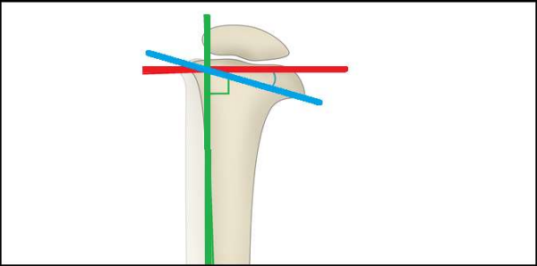 Figure 6: The metaphyseal-diaphyseal angle is a bit of a bad name because it is the angle between the metaphyseal slope and the line perpendicular to the diaphysis, not the diaphysis itself. To visualize this, draw a line along the length of the tibia (green) and a second line along its metaphyseal slope (blue). Then draw another line (red) perpendicular to the horizontal line. This angle is defined by the intersection of three (red) lines with the (blue) line along the metaphyseal slope.