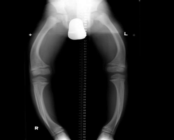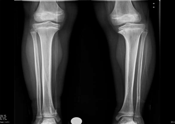 Figure 9: Severe bowing of the tibia (and femur) due to rickets. Rickets usually occur because of a lack of vitamin D or calcium, and results in weak bones in children. Adults can experience a similar condition, which is known as osteomalacia
