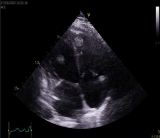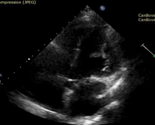 Image 1. 4Ch TTE of mass in LV and apex of RV