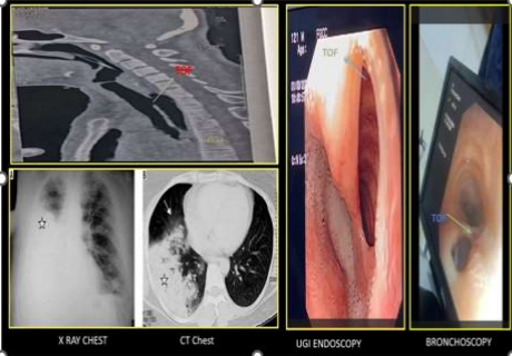 A 24-year-old lady who had recurrent upper respiratory tract infections for the past 6 months was treated by multiple physicians. Finally, the patient presented to a general surgeon who suspected TEF and advised CECT neck and chest revealed abnormal communication between the trachea and esophagus suggested TEF with diffuse patchy ground-glass opacities suggestive of aspiration pneumonia and right lung consolidation (Fig-1). They were referred to us for further management and presented to the emergency department with cough, breathlessness, tachypnoea, tachycardia, and hypoxia. The patient was resuscitated with IV fluids and oxygen. After Stabilization we planned surgery.