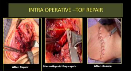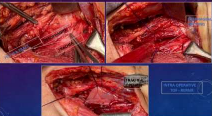 UGI-Endoscopy showed a large defect noted between the cervical esophagus and trachea located 23cm from the upper incisor. On Bronchoscopy communication between the trachea and esophagus was established. The patient was not associated with other congenital anomalies. The patient was intubated and the ET tip was located below the level of TEF but above the carina after confirming bilateral air entry. The patient was in a supine position with the neck extended and right lateral tilt. Laparoscopic feeding jejunostomy was done. Skin incision made along the anterior border of the sternocleidomastoid muscle. The Fistula tract was excised. The tracheal defect was closed by intermittent suture using 3-0 prolene and the esophageal defect was closed using 2-0 vicryl. The sternothyroid flap is placed between the trachea and esophagus (Fig-2,3,4). Biopsy from the fistula tract was suggestive of chronic inflammation and showed no evidence of active tuberculosis or malignancy.