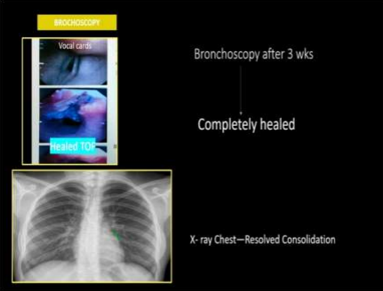 After 3 weeks, Bronchoscopy revealed a completely healed defect site of TEF, and chest x-ray revealed resolved consolidation. The patient is leading a normal life.(Fig-5)